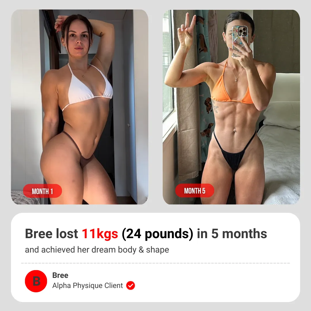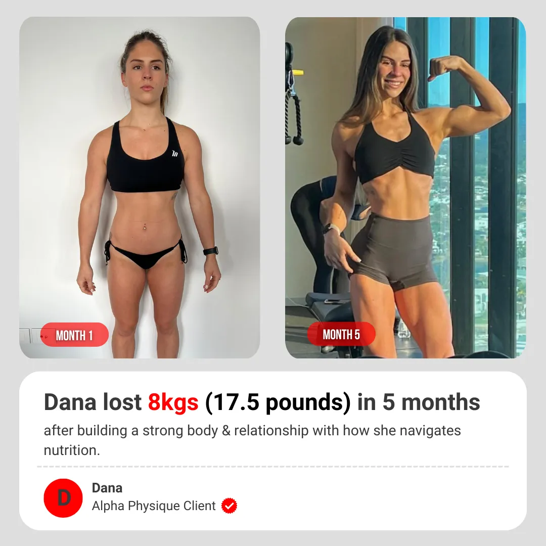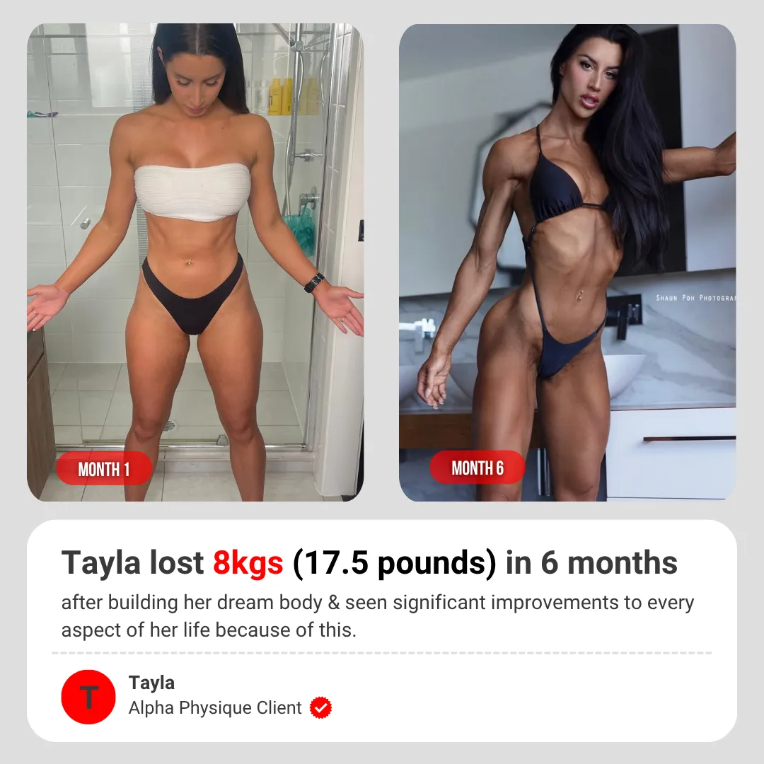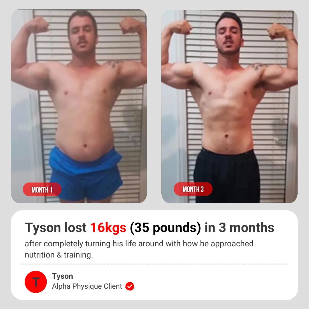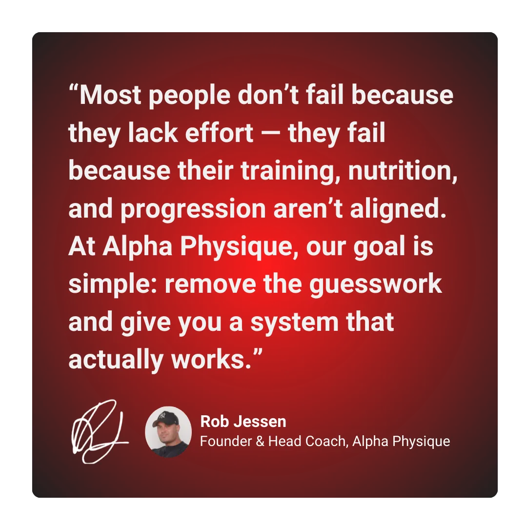 Disclaimer: Results shown are not typical and will vary based on individual effort, consistency, and starting point. Alpha Physique provides coaching and educational guidance only and does not guarantee specific outcomes. Nothing on this website should be considered medical advice. Please consult a qualified healthcare professional before beginning any fitness or nutrition program.
