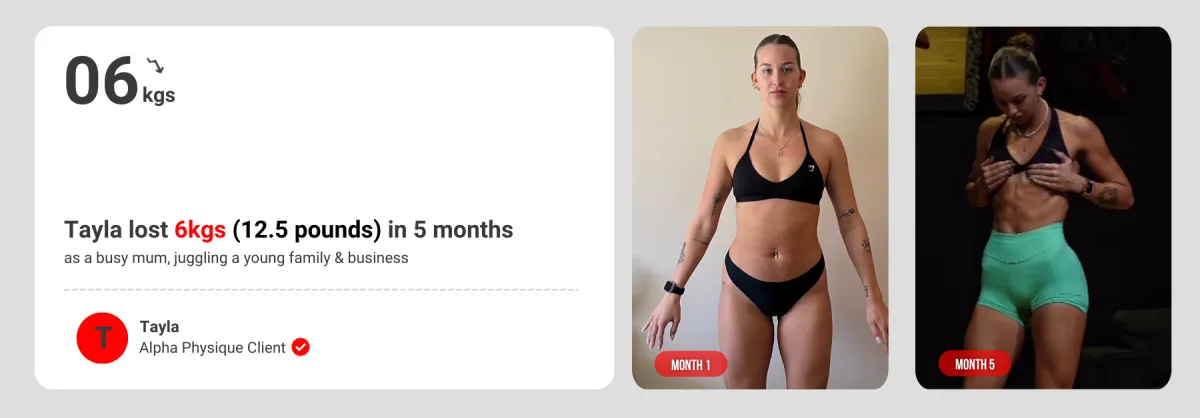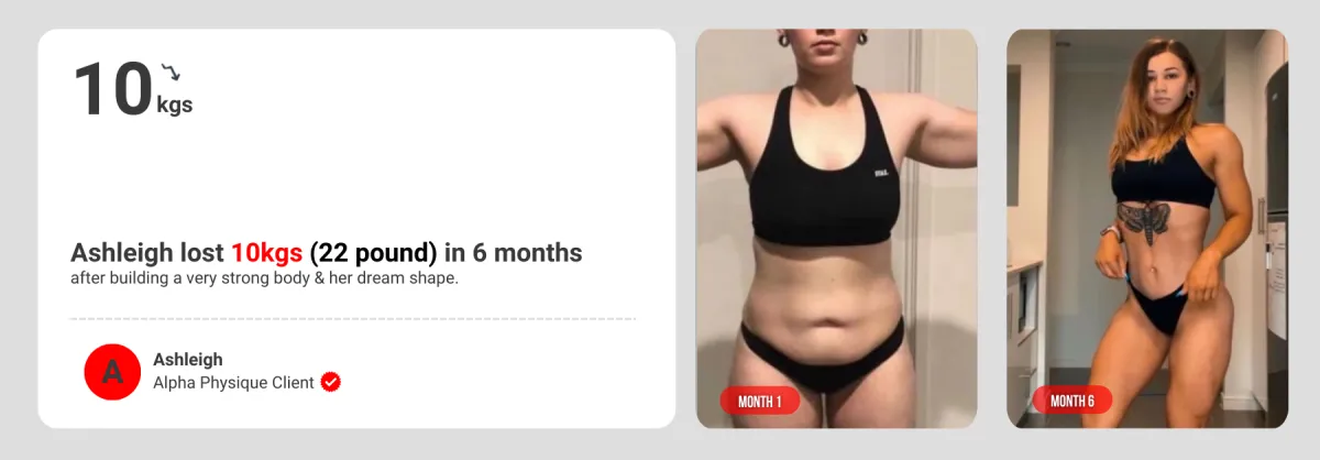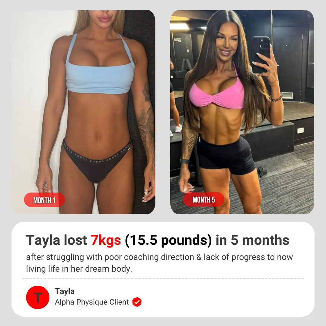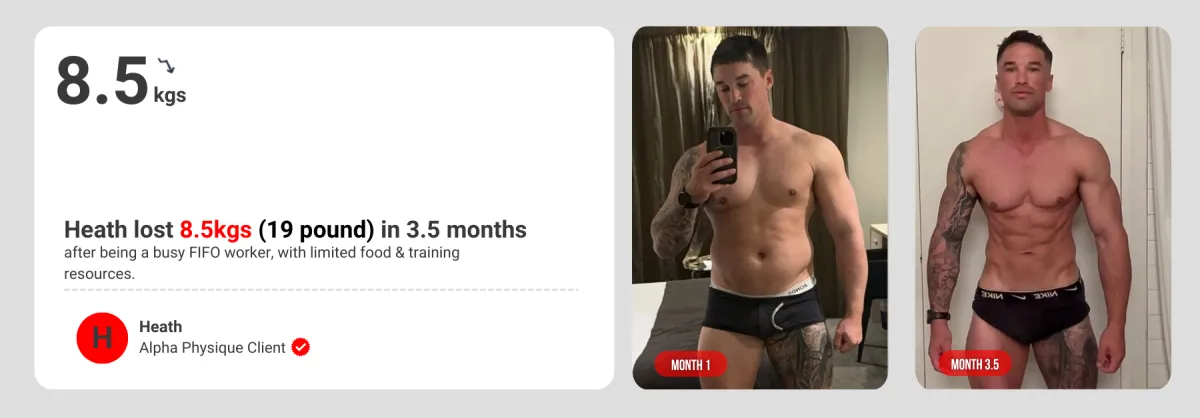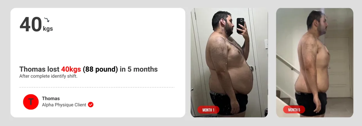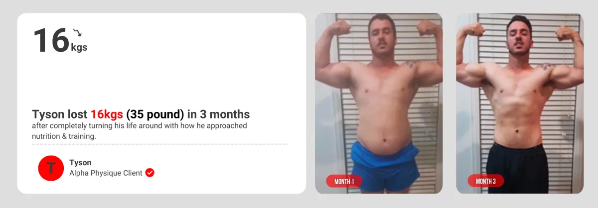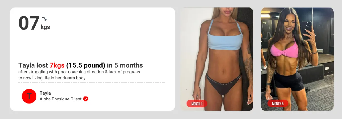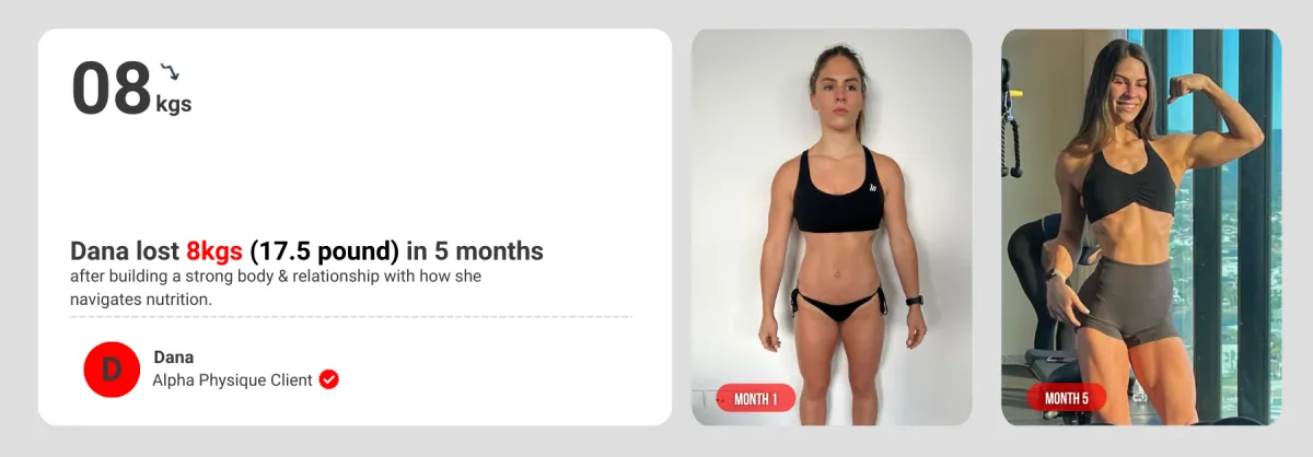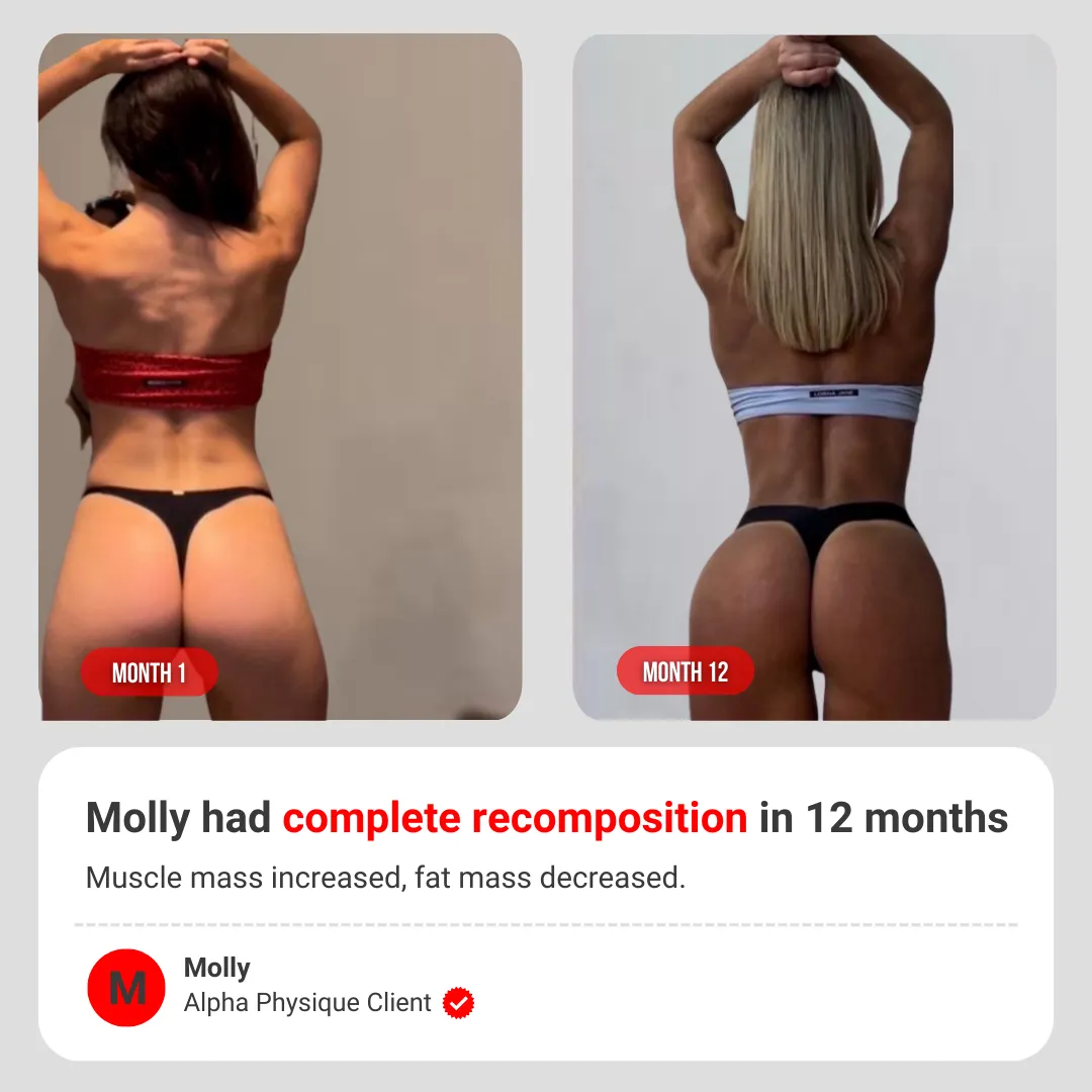 Disclaimer: Results shown are not typical and will vary based on individual effort, consistency, and starting point. Alpha Physique provides coaching and educational guidance only and does not guarantee specific outcomes. Nothing on this website should be considered medical advice. Please consult a qualified healthcare professional before beginning any fitness or nutrition program.