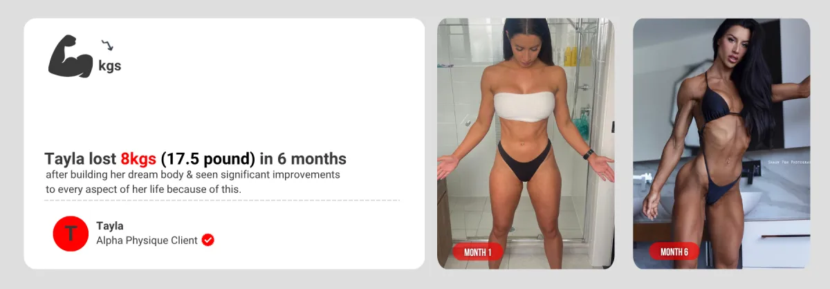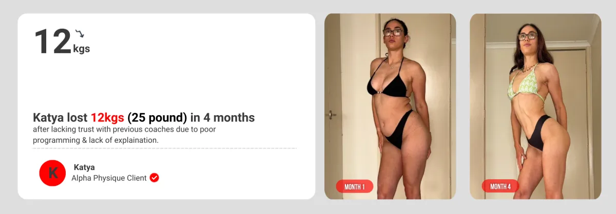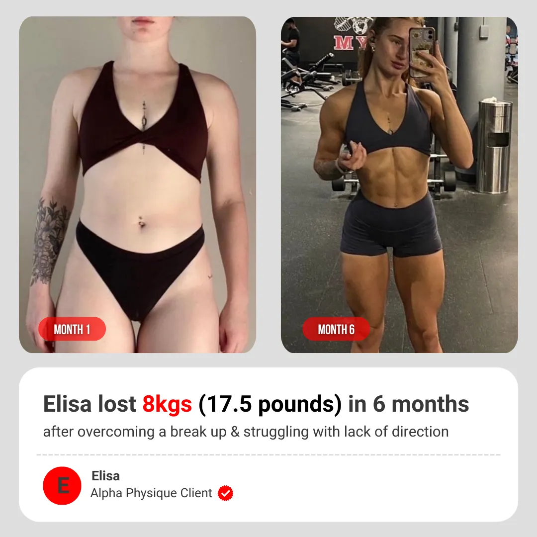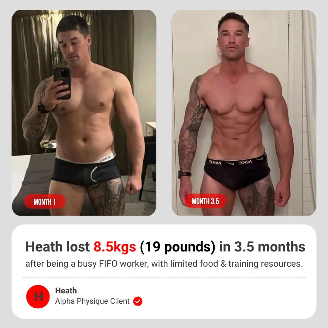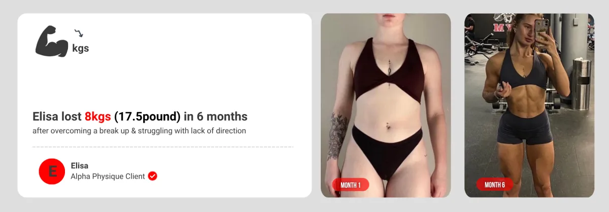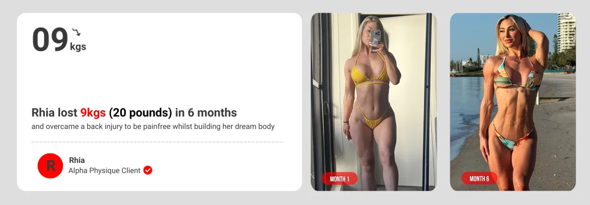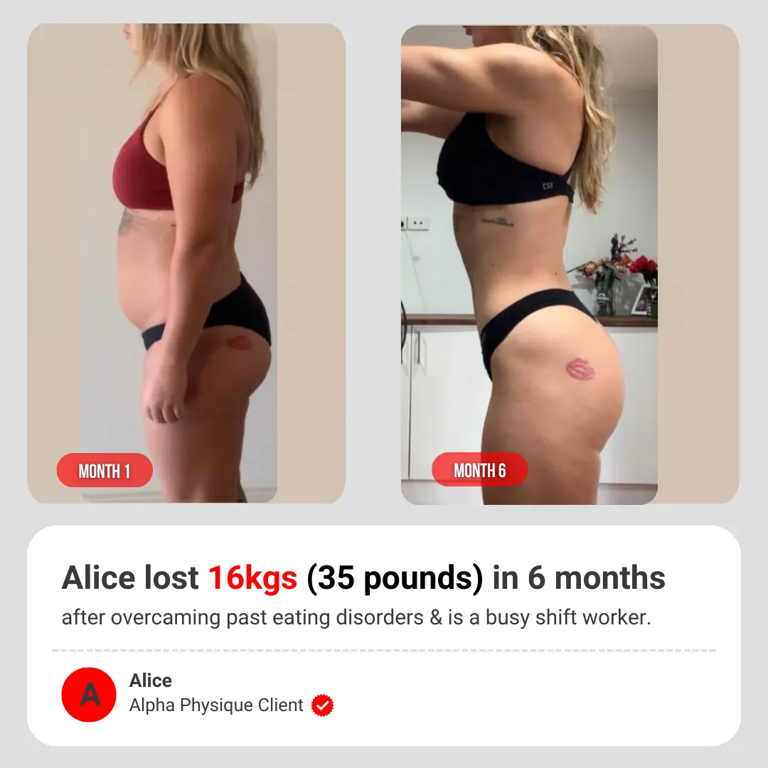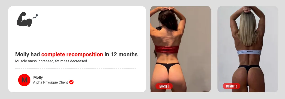 Disclaimer: Results shown are not typical and will vary based on individual effort, consistency, and starting point. Alpha Physique provides coaching and educational guidance only and does not guarantee specific outcomes. Nothing on this website should be considered medical advice. Please consult a qualified healthcare professional before beginning any fitness or nutrition program.